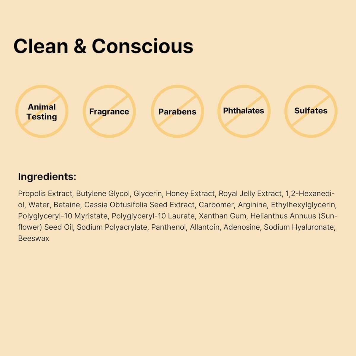 Propolis Extract, Butylene Glycol, Glycerin, Honey Extract, Royal Jelly Extract, 1,2-Hexanediol, Water, Betaine, Cassia Obtusifolia Seed Extract, Carbomer, Arginine, Ethylhexylglycerin, Polyglyceryl-10 Myristate, Polyglyceryl-10 Laurate, Xanthan Gum, Helianthus Annuus (Sunflower) Seed Oil, Sodium Polyacrylate, Panthenol, Allantoin, Adenosine, Sodium Hyaluronate, Beeswax