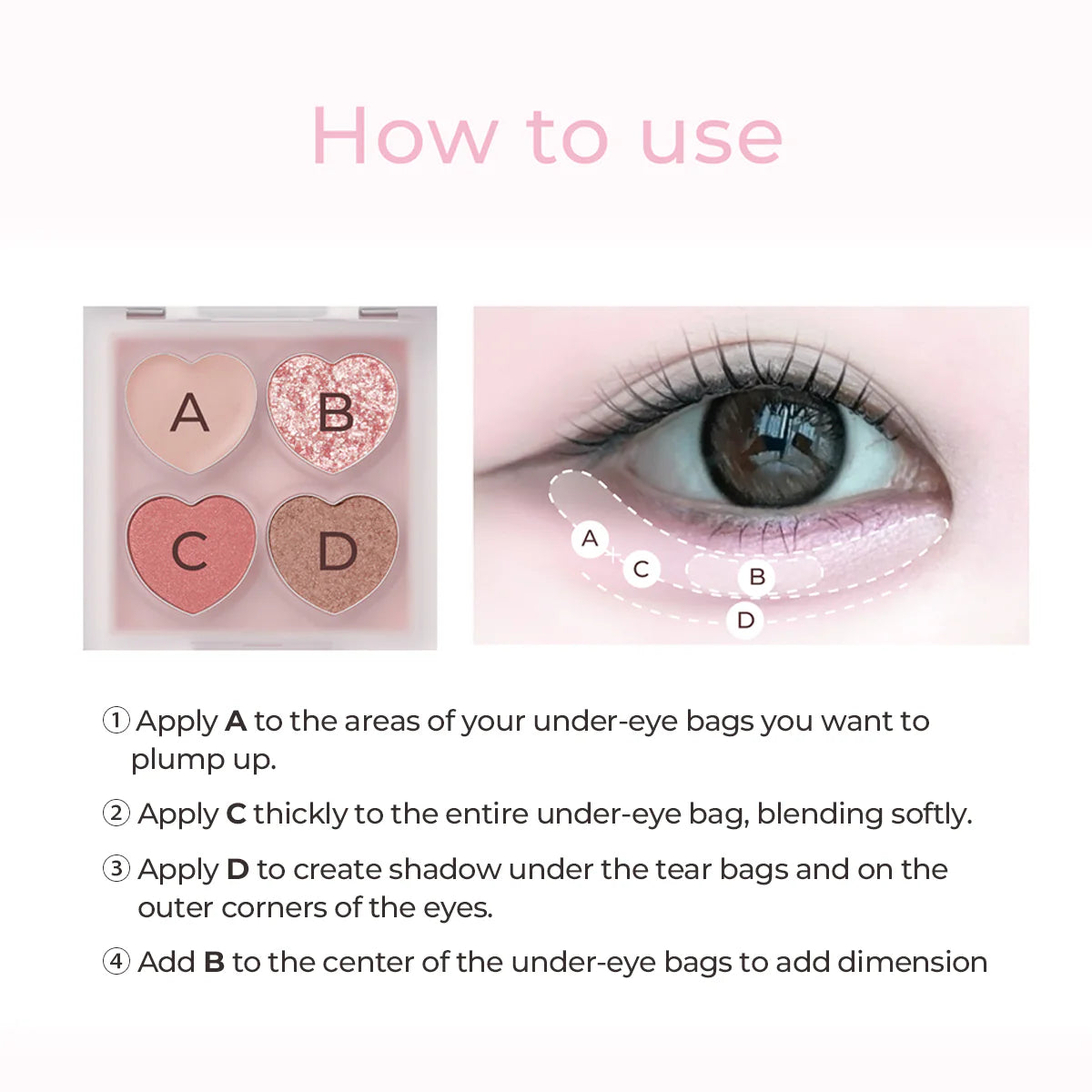 This palette contains four essential textures for under-eye bag makeup, allowing precise correction, contouring, and brightening in one compact tool. Its versatile shades work together to hide dark circles, define contours, and add natural highlights, making it ideal for achieving a professional under-eye makeup look with minimal effort. Perfect for both everyday wear and special occasions, it delivers lasting results with a natural finish.