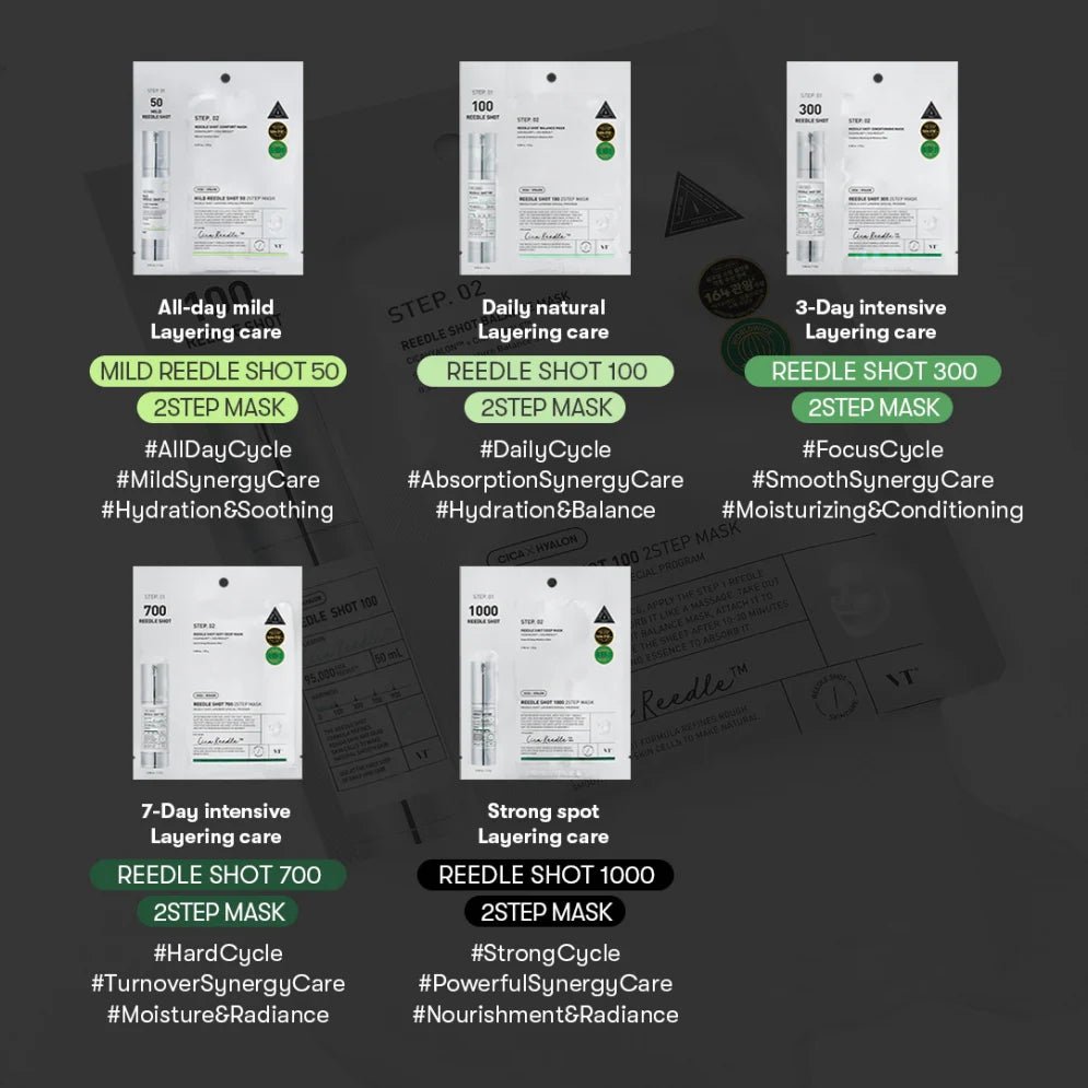 VT Mild Reedle Shot 100 2-Step Mask is a soothing, targeted treatment that calms and hydrates skin while refining pores for a smoother texture.