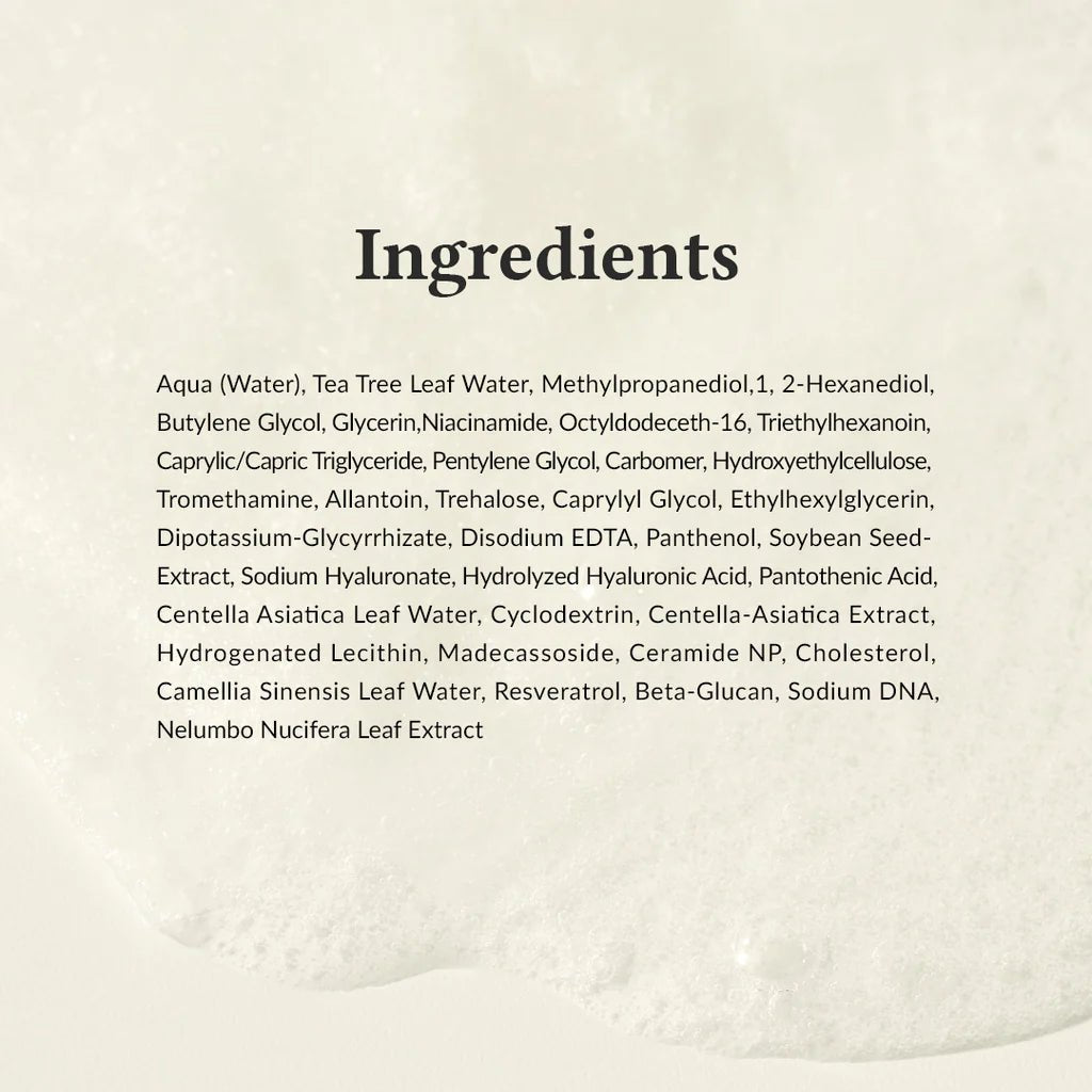 Water(Aqua), Melaleuca Alternifolia (Tea Tree) Leaf Water, Methylpropanediol, 1,2-Hexanediol, Butylene Glycol, Glycerin, Niacinamide, Octyldodeceth-16, Triethylhexanoin, Caprylic/Capric Tri-glyceride, Pentylene Glycol, Carbomer, Hydroxyethylcellulose, Tromethamine, Allantoin, Trehalose, Caprylyl Glycol, Ethylhexylglycer-in, Dipotassium Glycyrrhizate, Disodium EDTA, Panthenol, Glycine Soja (Soybean) Seed Extract, Sodium Hyaluronate, Hydrolyzed Hyaluronic Acid, Pantothenic Acid, Centella Asiatica Leaf Water, Cyclodextrin, Cen-tella Asiatica Extract, Hydrogenated Lecithin, Madecassoside, Ceramide NP, Cholesterol, Camellia Sinensis Leaf Water, Reveratrol, Beta-Glucan, Sodium DNA, Nelumbo Nucifera Leaf Extract