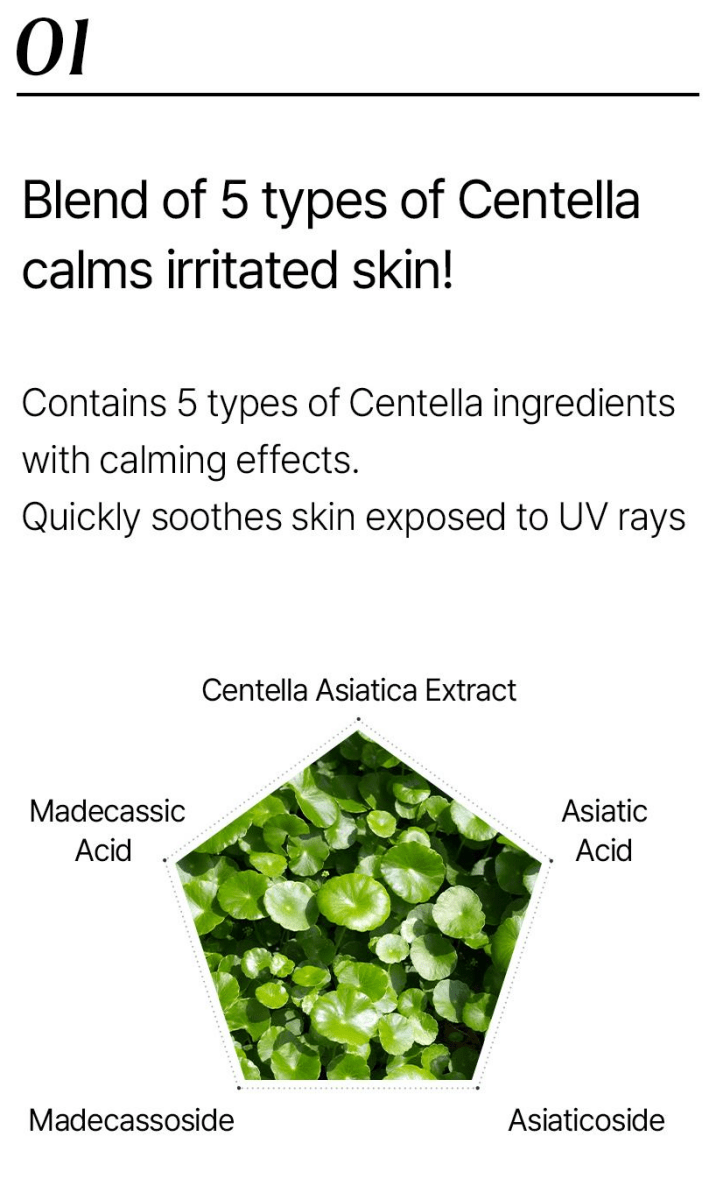 Water, Glycerin, Niacinamide, Carrageenan, Butylene Glycol, Allantoin, Adenosine, Sodium Hyaluronate, Hydrolyzed Hyaluronic Acid, Sodium Hyaluronate Crosspolymer, Centella Asiatica Extract, Madecassoside, Asiaticoside, Madecassic Acid, Asiatic Acid, Lactobacillus Ferment Lysate, Dipotassium Glycyrrhizate, Houttuynia Cordata Extract, Dandelion Leaf Extract, Turmeric Root Extract, Copper Tripeptide-1, Acetyl Hexapeptide-8, and botanical extracts.