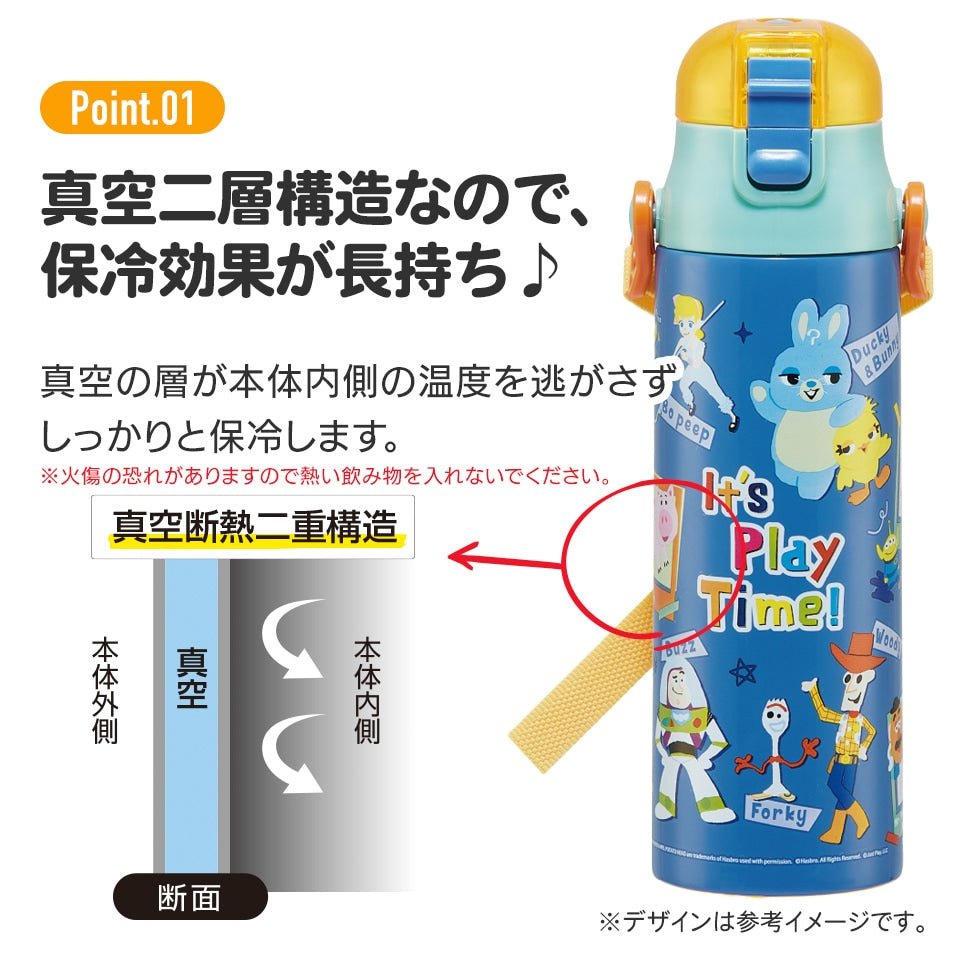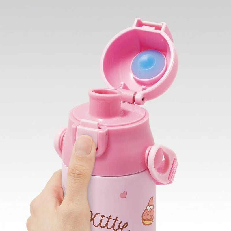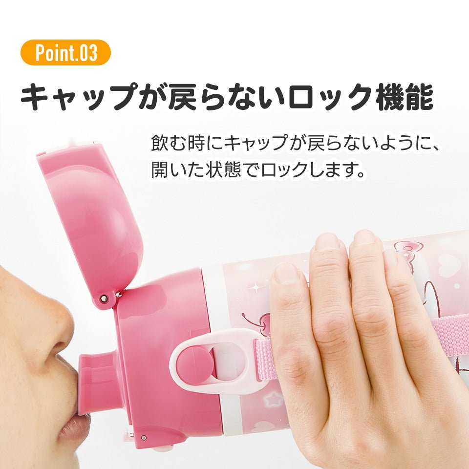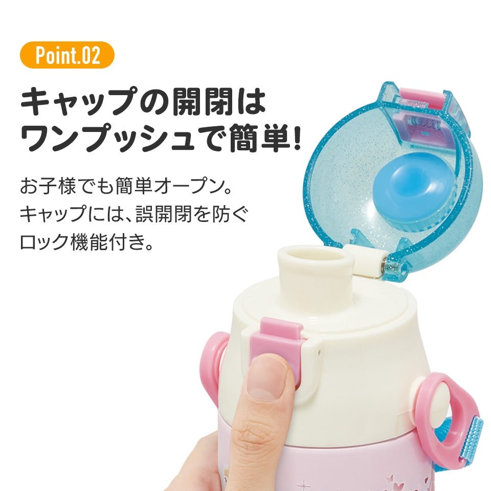 This direct stainless steel bottle opens with one push, so you can drink whenever you want. The shoulder strap with nameplate makes it perfect for going out! The stainless steel vacuum double-wall structure keeps the drink cold for a long time!