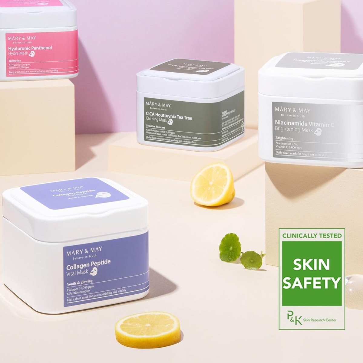 MARY & MAY Collagen Peptide Vital Mask is a hydrating and firming sheet mask infused with collagen and six types of peptides to help restore skin elasticity and reduce the appearance of fine lines. Each mask is individually packed for freshness and convenience, delivering a quick boost of moisture and vitality to tired skin.